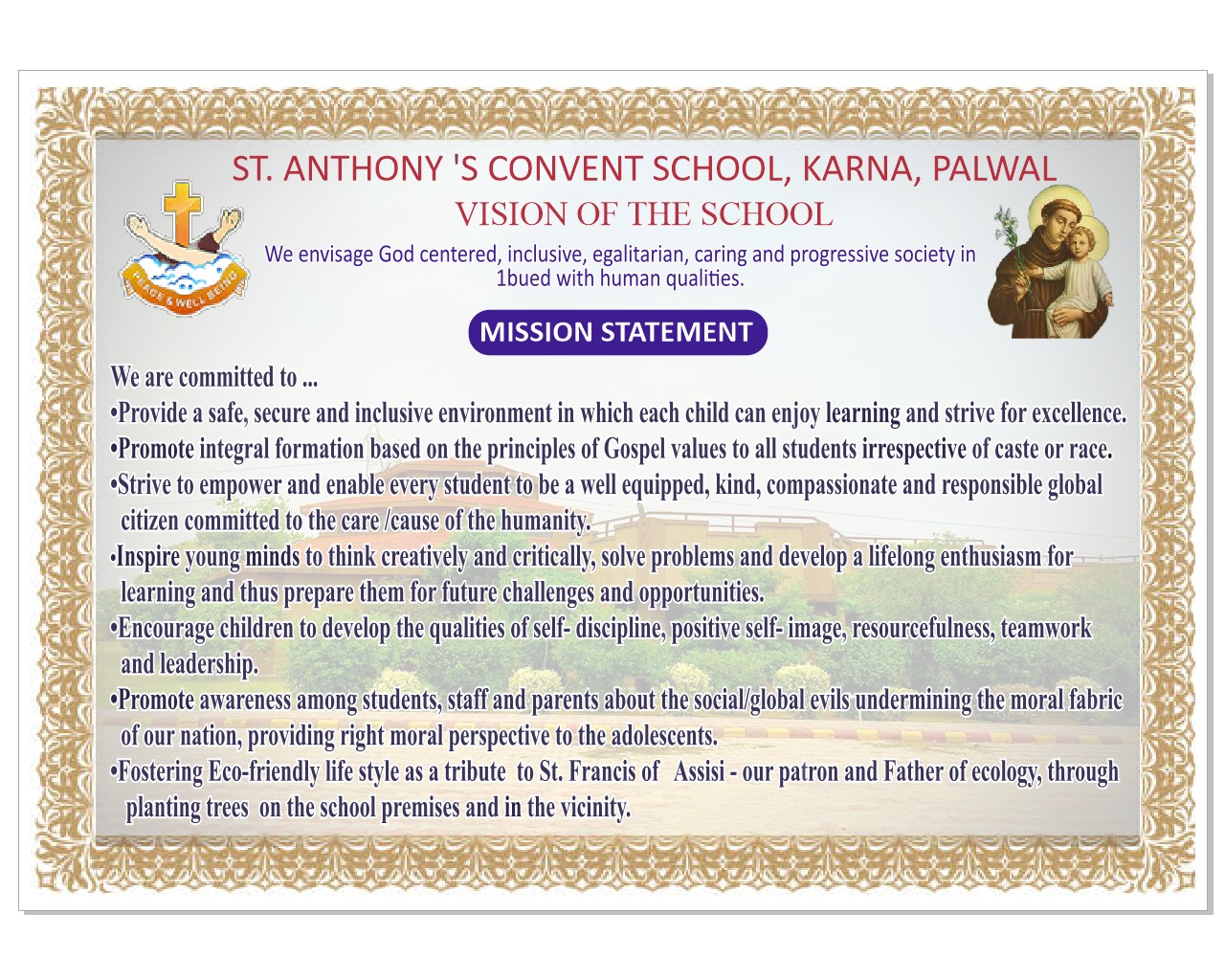 St. Anthony’s Convent School, Karna, Palwal, is an unaided Christian minority school. It is owned by the Institute of the Clarist Franciscan Sisters of the Most Blessed Sacrament and run by the St. Francis Charitable Society, a body registered under the Societies Registration Act XXI 1860 and having its office at Clara Niwas, Kalu Sarai, New Delhi - 110016. The group runs English/vernacular-medium schools, orphanages,Dispensaries , homes for senior citizens, working girls' hostels, and other welfare centers in various parts of the country, especially in the remotest hinterlands.