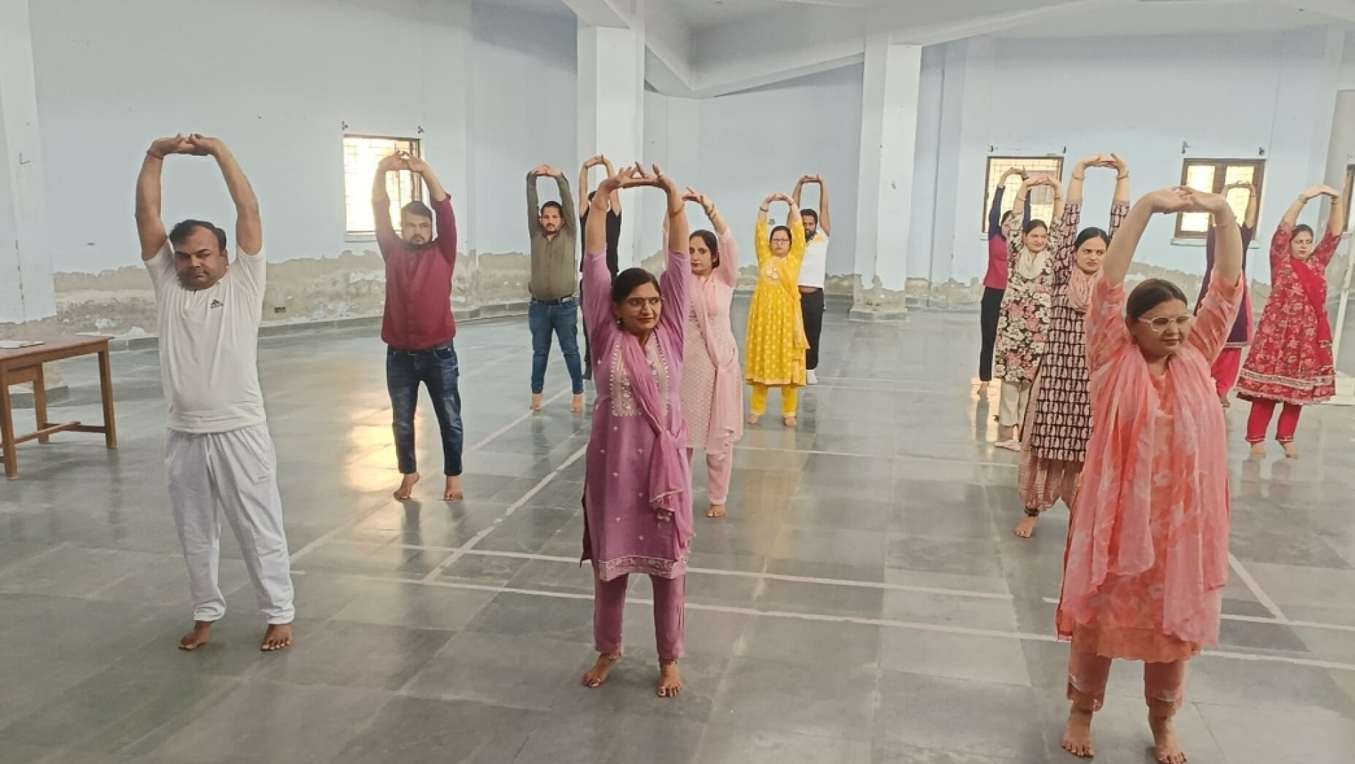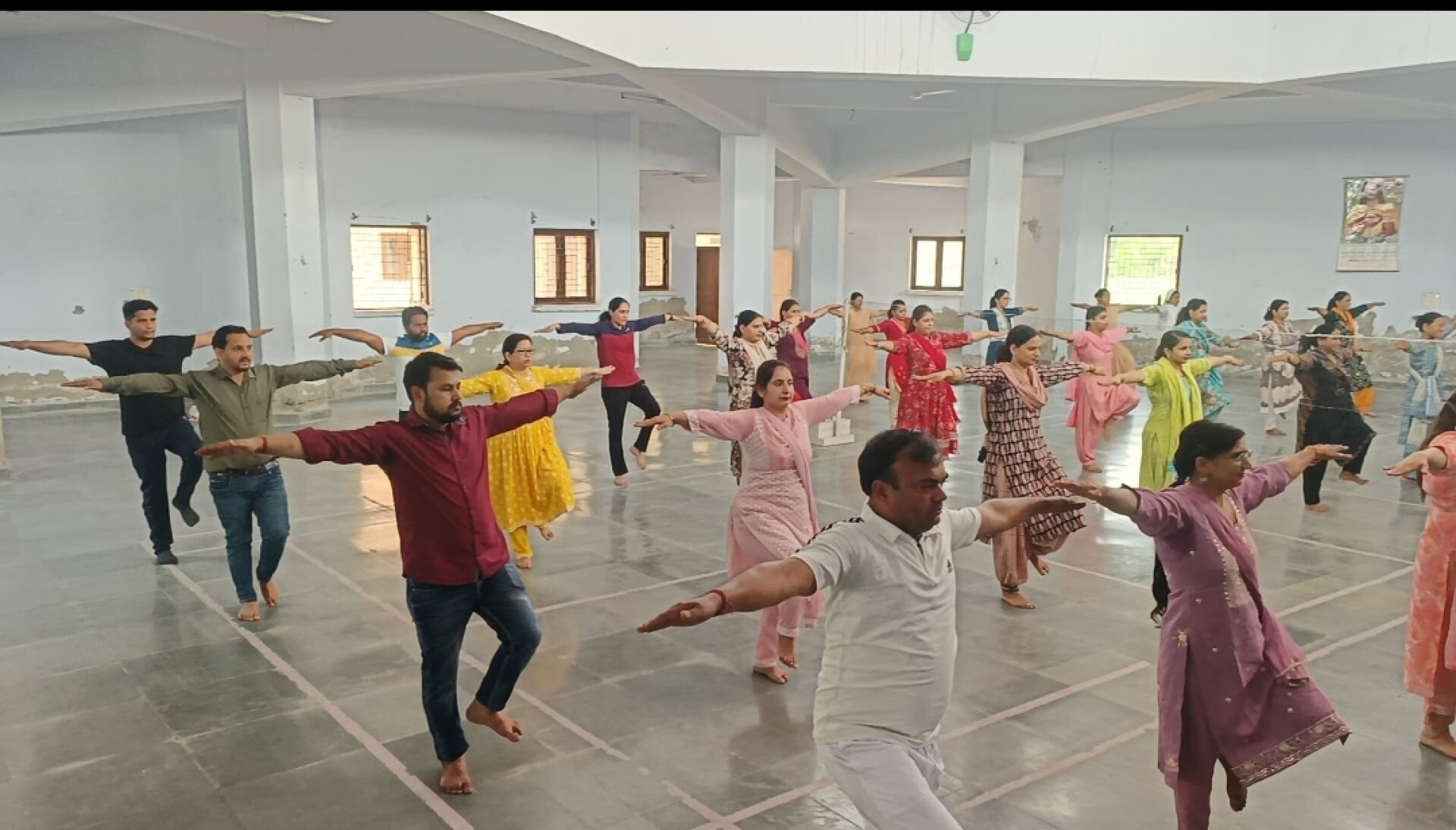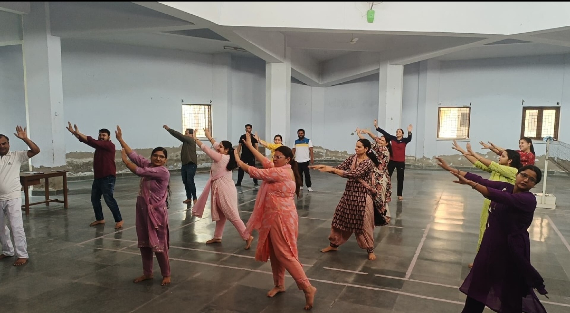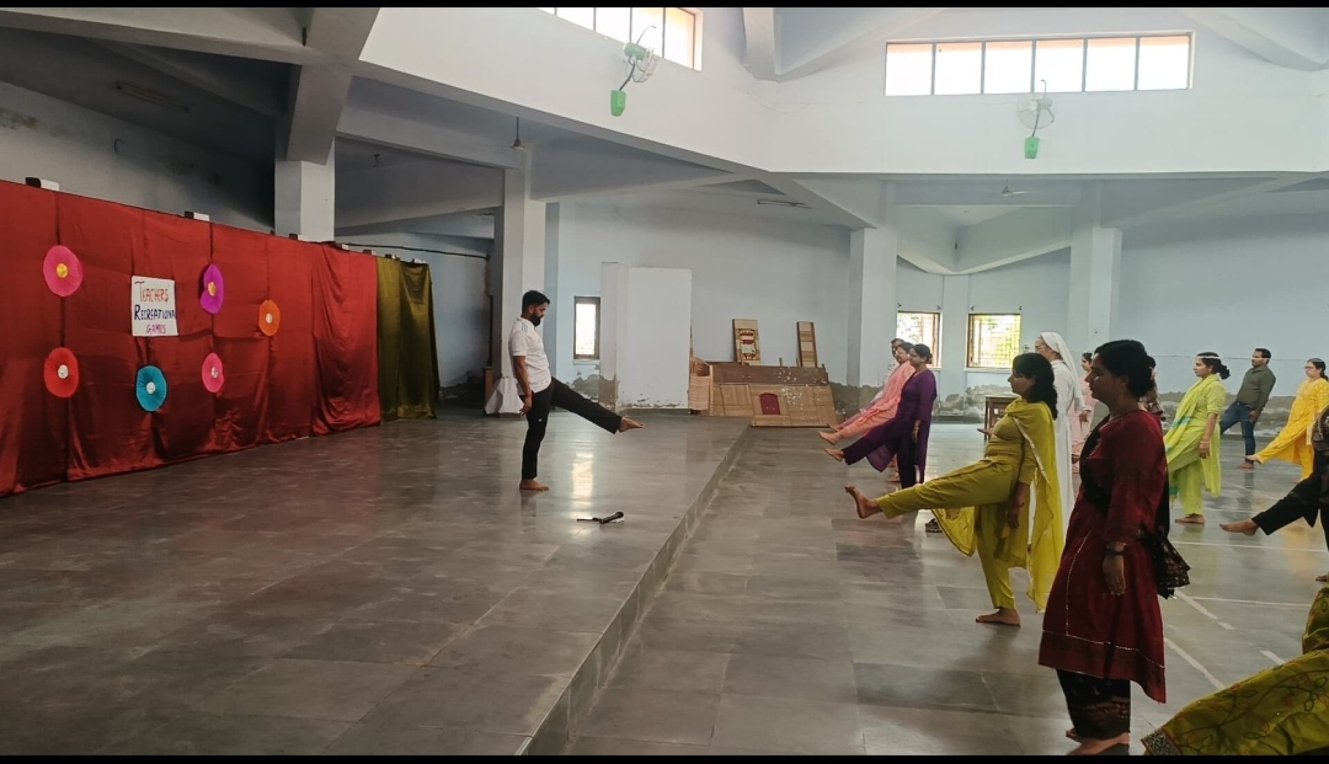 Description: The venue of the event is the multipurpose hall. To promote wellness and relaxation a Teachers Recreational Games session was organized just before the summer break. The event included yoga Zumba and fun games aimed at reducing stress and boosting team spirit among the teaching staff. (A)Activities: 1) Yoga: Guided breathing exercises basic asanas and relaxation techniques. 2) Zumba: Energetic dance session to lively music promoting fitness and fun. 3) Games: Musical chairs tug of war and balloon relay added excitement and laughter. (B)Outcome: Teachers enjoyed the sessions thoroughly and appreciated the refreshing break. It was a great way to end the term on a positive healthy note. The school plans to organize such events more frequently.