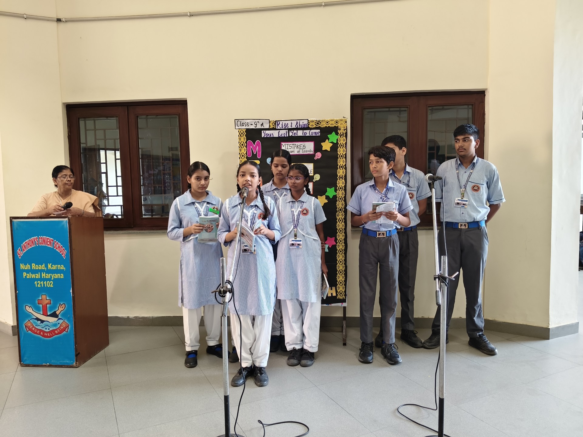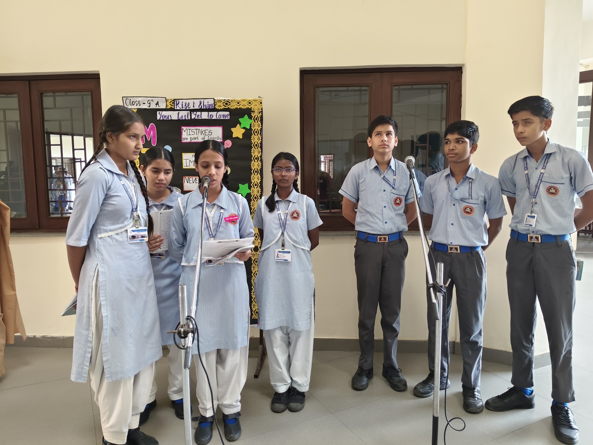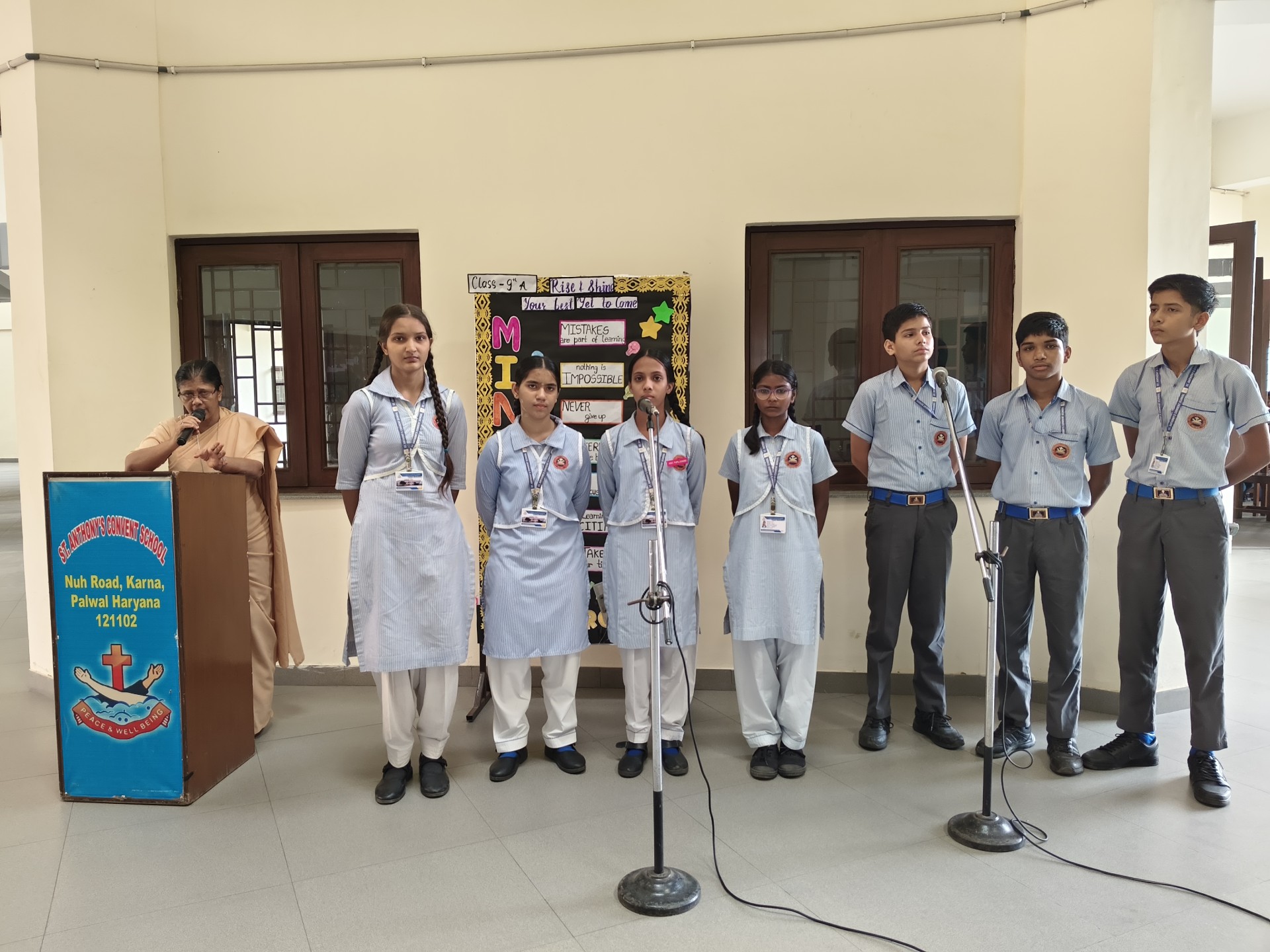 Description: Report on School Assembly by Class 9 (A B) Date: 16th September 30th September 2025 Venue: School Assembly Ground The students of Class 9 (A and B) conducted the morning assemblies for two weeks on inspiring themes Rise and Shine: Your Best is Yet to Come by Class 9A and Calm Mind and Sharp Mind: Motivation and Self-Belief by Class 9B. The first weeks assembly presented by Class 9A focused on the theme Rise and Shine: Your Best is Yet to Come. Through motivational speeches quotes and a short skit students conveyed the message that challenges are stepping stones to success and that one should always strive to improve with hope and determination. The assembly encouraged everyone to stay positive and keep working towards their dreams. In the second week Class 9B led the assembly on Calm Mind and Sharp Mind: Motivation and Self-Belief. Students shared inspirational thoughts and speeches emphasizing the importance of staying calm confident and focused even in difficult situations. The presentations motivated all to develop inner strength and believe in their abilities. Our Principal Sr. Abha appreciated the efforts of both sections for organizing such meaningful and inspiring assemblies. She reminded students that success comes to those who stay disciplined motivated and believe in themselves. The two-week assembly series concluded with the national anthem leaving everyone motivated to stay calm confident and always ready toriseandshine.