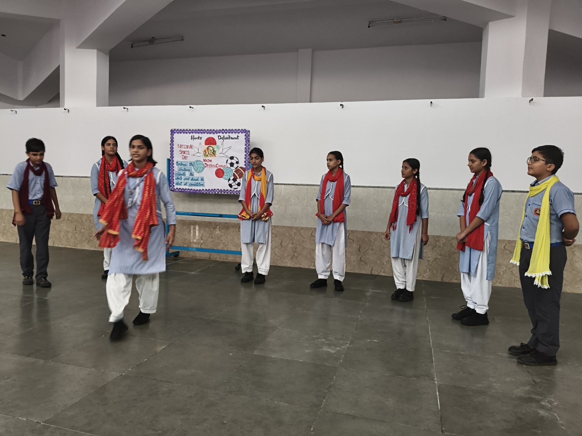 Description: National Sports Day is celebrated annually in India on August 29th. The day commemorates the birth anniversary of Major Dhyan Chand a legendary field hockey player widely regarded as one of the greatest of all time. Known as The Wizard of Hockey Major Dhyan Chand led the Indian hockey team to three consecutive Olympic gold medals in 1928 1932 and 1936. The celebration of National Sports Day serves to honor his legacy and promote the importance of sports and physical fitness in daily life. It is a day to recognize the achievements of our nations athletes and encourage a culture of sportsmanship discipline and healthy living among the youth. Activities Held on National Sports Day Our school celebrated National Sports Day with a series of vibrant and engaging events that showcased the spirit of sports and teamwork. 1. Dance on Different Sports A dynamic dance performance was presented by students creatively blending various dance forms with the movements of different sports. The routine featured a medley of actions from cricket football basketball and gymnastics set to upbeat music. This performance was a joyful and artistic tribute to the diversity of sports and highlighted the grace and skill involved in each one. 2. Speech A compelling speech was delivered by a student reflecting on the significance of National Sports Day. The speech paid tribute to Major Dhyan Chand and other Indian sports heroes. It emphasized how sports teach us valuable life lessons such as perseverance teamwork and leadership. The speaker encouraged all students to adopt a sport or physical activity as a part of their daily routine for a healthier and more disciplined life. 3. Nukkad Natak (Street Play) The highlight of the day was a powerful Nukkad Natak performed by a group of students. The play addressed the theme of Sports for All and tackled issues such as the importance of equal opportunities in sports the challenges faced by aspiring athletes and the need to balance academics with physic