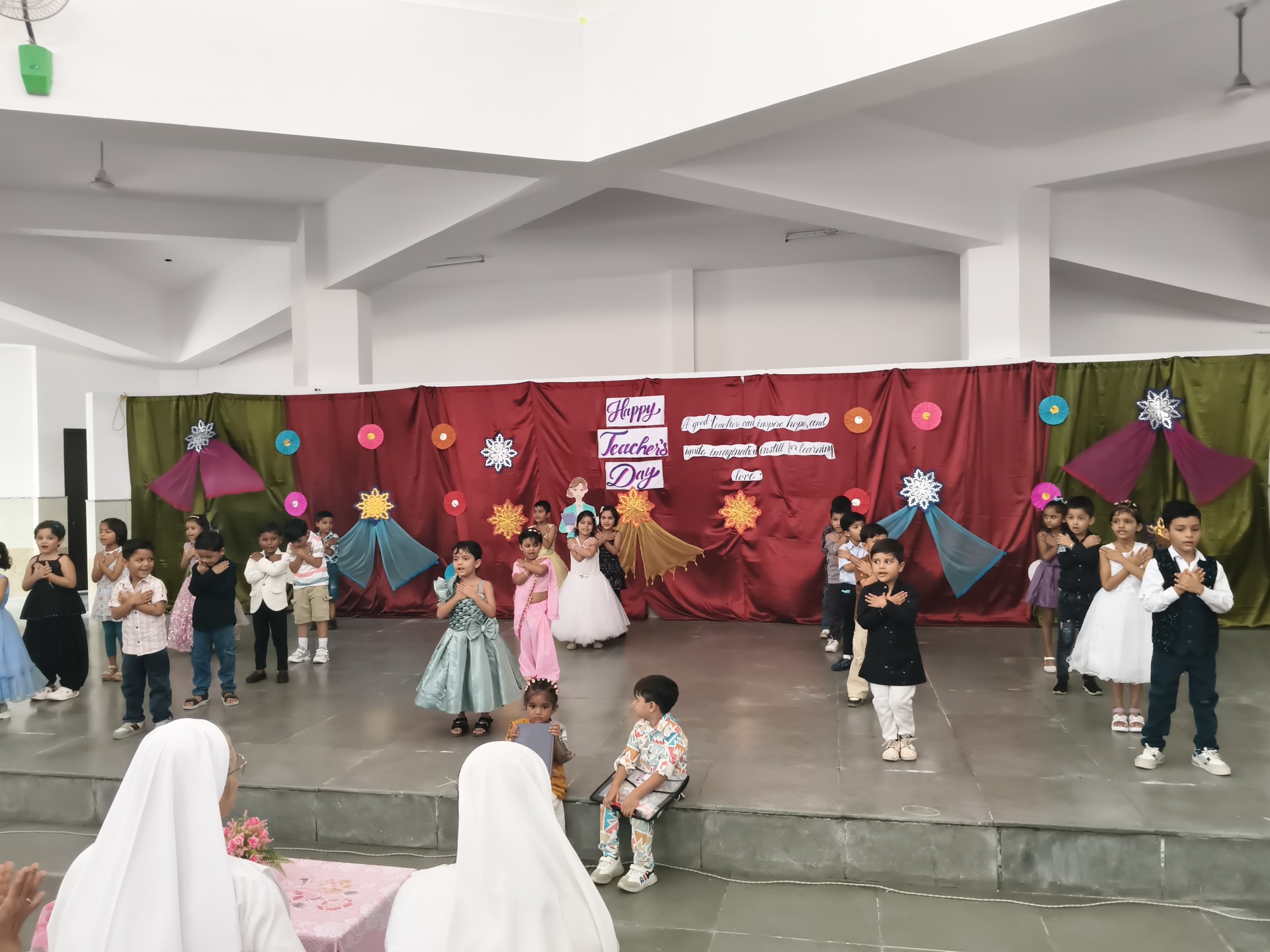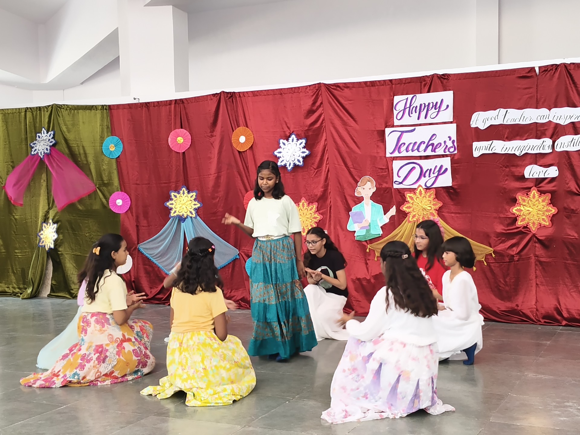 Description: Teachers Day Celebration Report Date: 5th September 2025 Venue: Multi-Purpose Hall Teachers Day was celebrated in our school with great enthusiasm and respect to honour the invaluable contribution of teachers in shaping young minds. A special programme was organized by the students to express their gratitude and love towards their teachers. The event commenced with the warm welcome of teachers with a band and tilak ceremony creating a festive and respectful atmosphere. This was followed by a brief introduction highlighting the significance of Teachers Day and remembering Dr. Sarvepalli Radhakrishnans contribution to education. The auspicious ceremony of lamp lighting was conducted to mark the beginning of the celebration symbolizing knowledge and wisdom. This was followed by a graceful prayer dance setting a serene tone for the day. The cultural performances began with a dance performance by LKG and UKG students on the theme Thank You Teachers which won everyones hearts with their innocence and energy. Next the Class 9th girls presented a vibrant mashup dance followed by Classes 1st to 3rd dancing to the lively number Bum Bum Bole filling the atmosphere with joy and cheer. Students of Classes 8th and 9th presented a skit showcasing the role of teachers in students lives in a creative and entertaining manner. To make the day even more engaging fun games were organized for teachers including: Balloon Bust with Dart Flowing Cup with Balloon Cone Collection and Basket Game A heartfelt message by one of the teachers was shared expressing gratitude and love for the students. The cultural segment continued with Classes 4th and 5th dancing to All is Well followed by a musical performance by Classes 6th and 7th on Shukriya Song. The Class 10th girls concluded the dance performances with a dynamic mashup showcasing their talent and enthusiasm. The fun continued with more games such as Red Light Green Light Balloon in the Basket (with blindfolded help) and Baat k