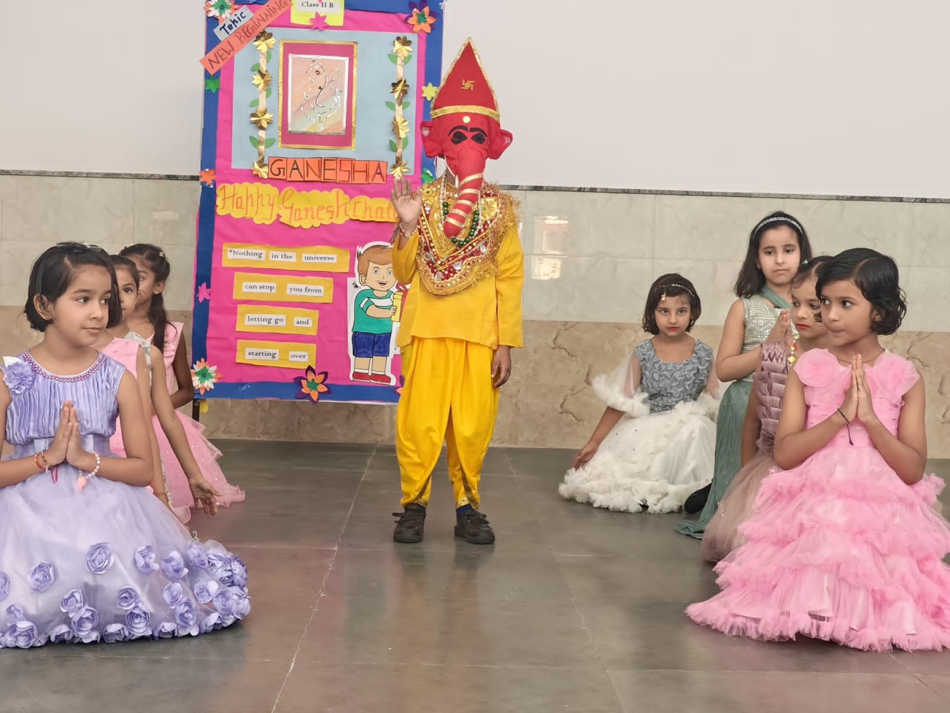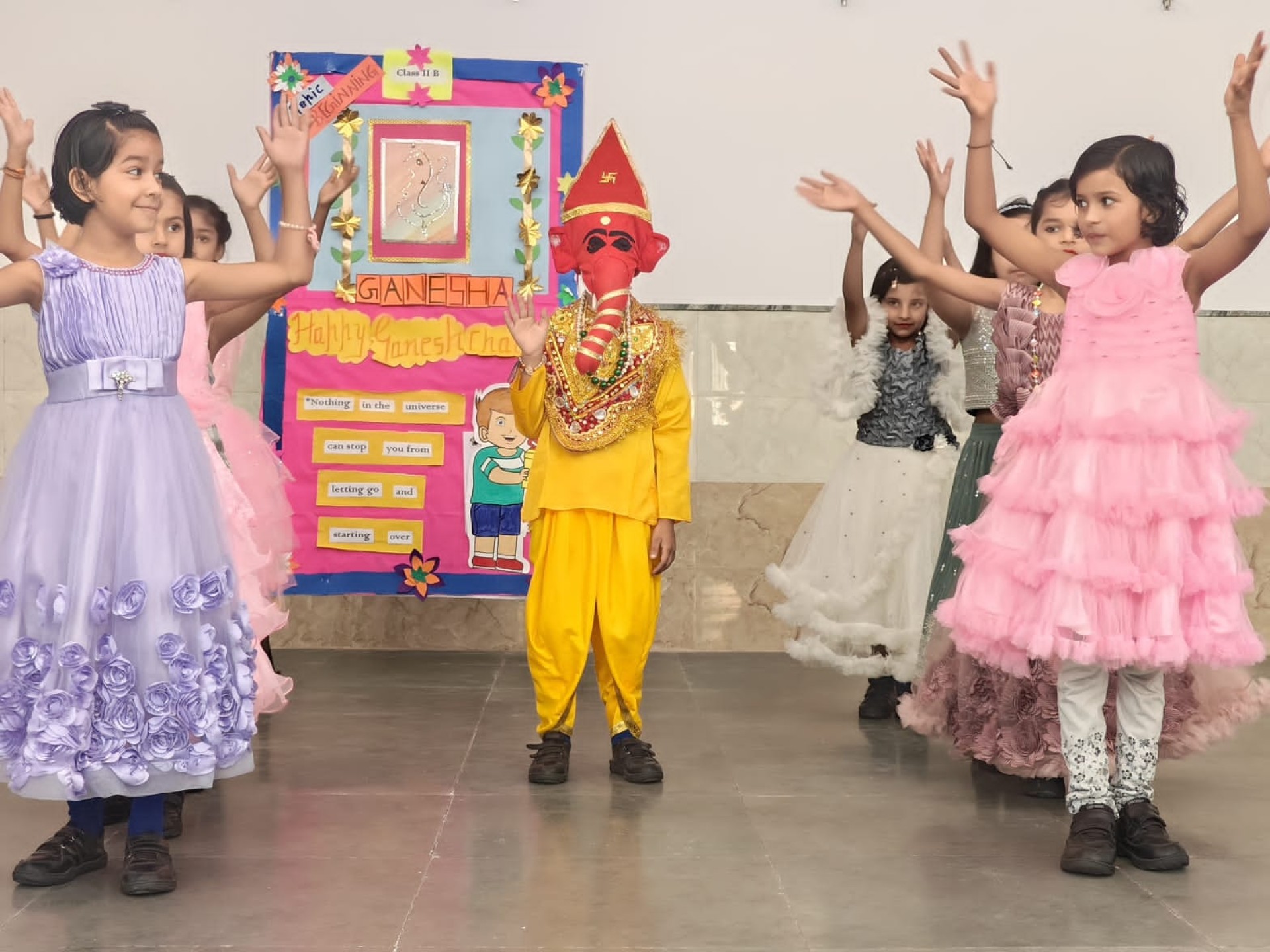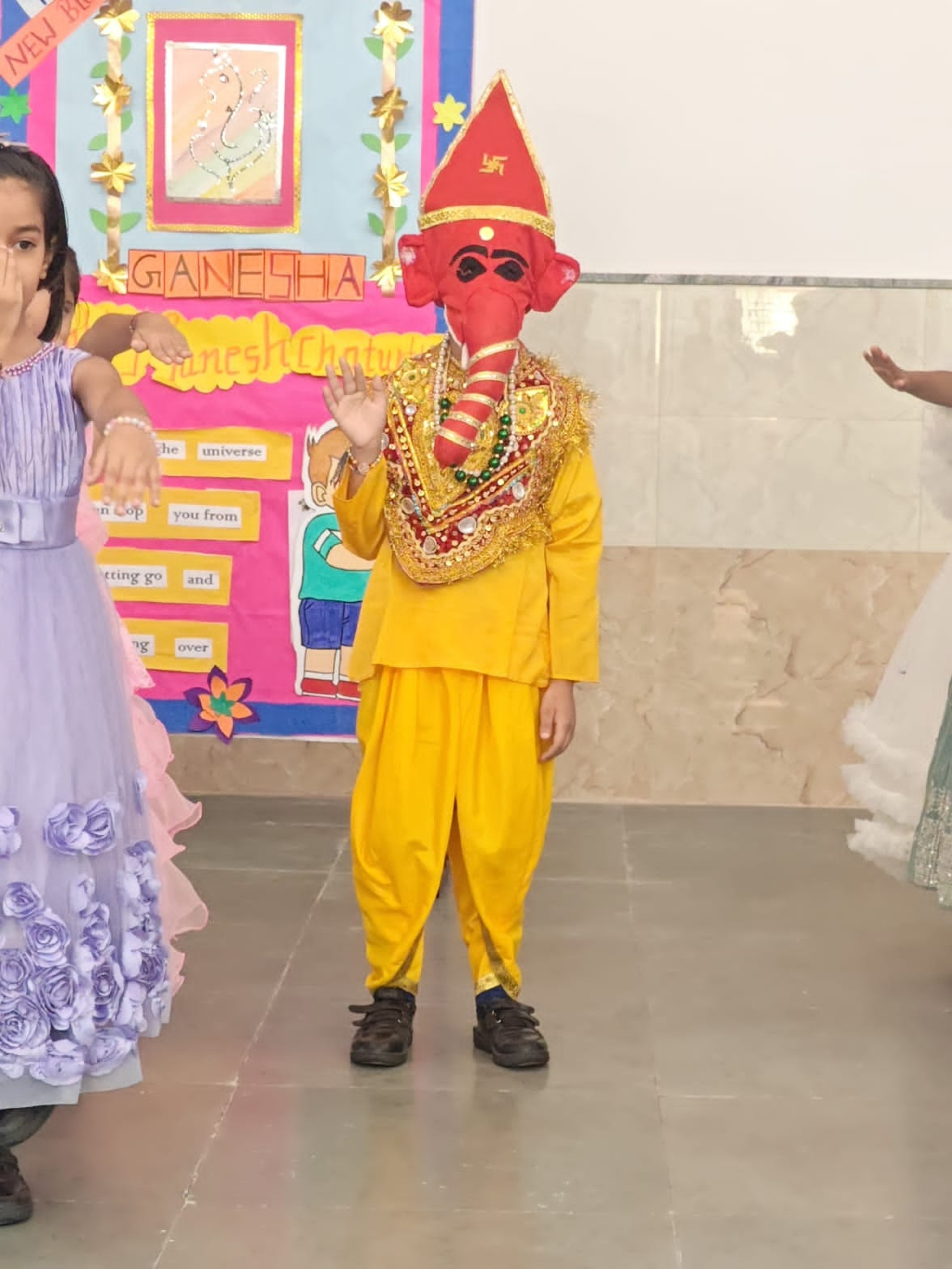 Description: Report on Ganesh Chaturthi Celebration Date: 22nd August 2025 Venue: Multipurpose Hall The festival of Ganesh Chaturthi was celebrated with great devotion and joy in our school. A special assembly was organized by the students of Class II-B to mark the auspicious occasion. The celebration began with a short introduction about the significance of the festival followed by a beautiful dance performance by the little ones showcasing their enthusiasm and devotion towards Lord Ganesha. The vibrant costumes and energetic moves filled the atmosphere with festive spirit. Our Principal Sr. Abha delivered an inspiring message highlighting the importance of Lord Ganeshas teachings wisdom patience and positivity. She encouraged students to seek knowledge and remove obstacles through hard work and good deeds just as Lord Ganesha symbolizes. The celebration concluded with prayers for peace prosperity and happiness for everyone. The day was filled with devotion excitement and a sense oftogetherness.
