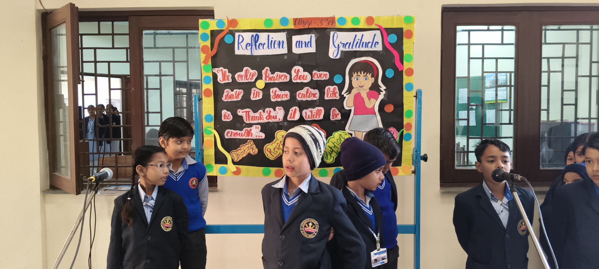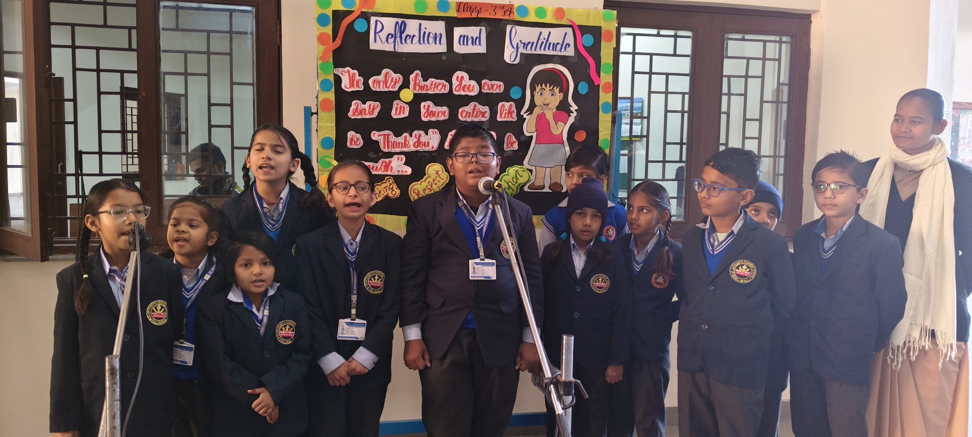 Description: School Report on Morning Assembly Class: III A Theme: Gratitude and Reflection Date: 8 December 2025 to 13 December 2025 The morning assembly on the theme Gratitude and Reflection was conducted successfully for Class III A. The assembly aimed to instill values of thankfulness self-awareness and positive thinking among students. The assembly began with a prayer creating a calm and positive atmosphere. This was followed by a Thought for the Day which highlighted the importance of being grateful and reflecting on ones actions. Students actively participated by presenting short speeches meaningful slogans a pledge and a poem. Through their presentations they beautifully expressed how gratitude and reflection help us become better individuals and develop empathy towards others. The assembly helped students understand the value of appreciating the support and efforts of parents teachers and fellow students. It encouraged them to be thankful for what they have and to reflect on their daily actions. Overall the morning assembly was meaningful and inspiring. It successfully conveyed moral values and helped students develop positive attitudes gratitude and good character traits.